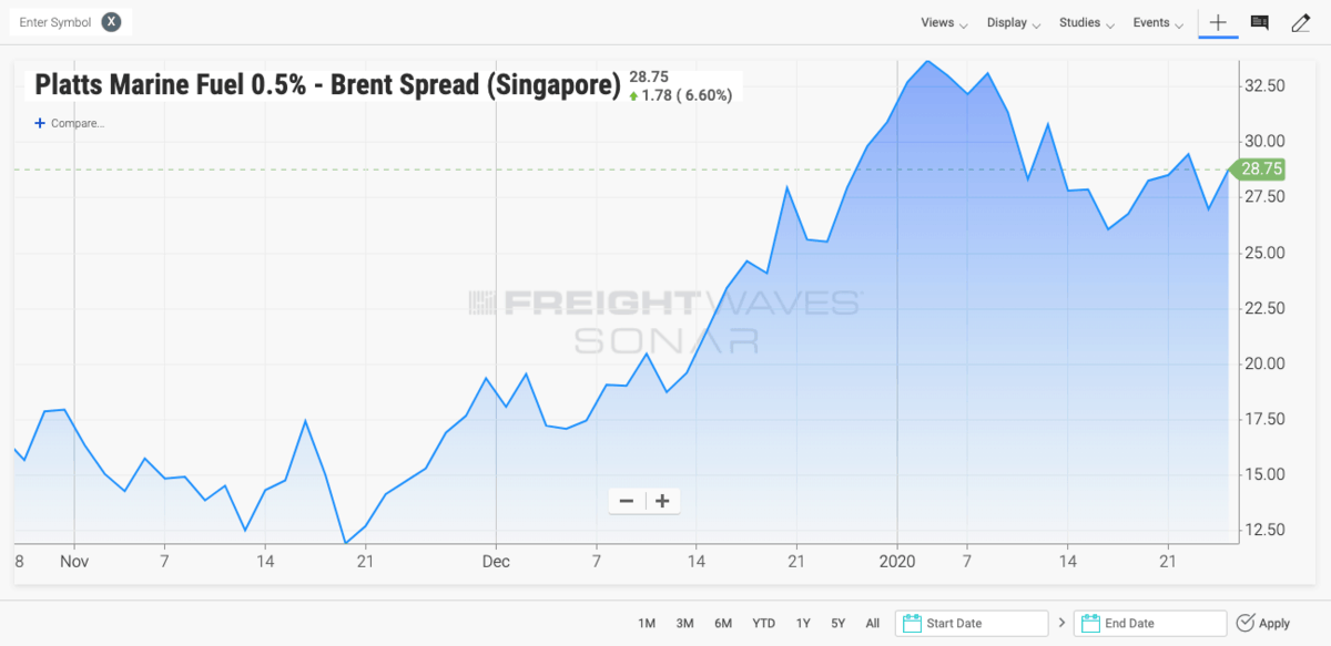 Low-sulfur marine fuel prices can also be viewed relative to the price of North Sea Brent crude oil, a global benchmark. The spread as of Jan. 24 (SONAR: MF5B.SNG) indicated low-sulfur marine fuel was trading at $89 per barrel in Singapore.