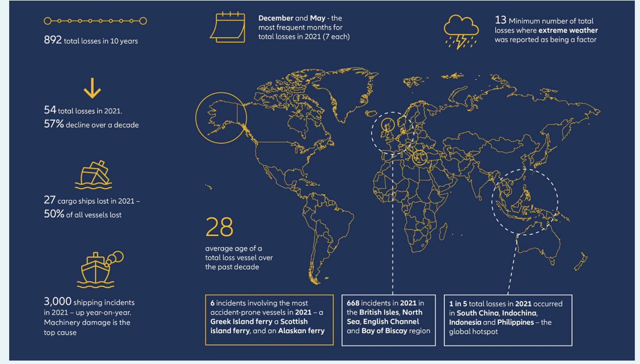 Allianz Global’s Safety & Shipping Review 2022 analyzes losses and incidents for ships of more than 100 gross tons.