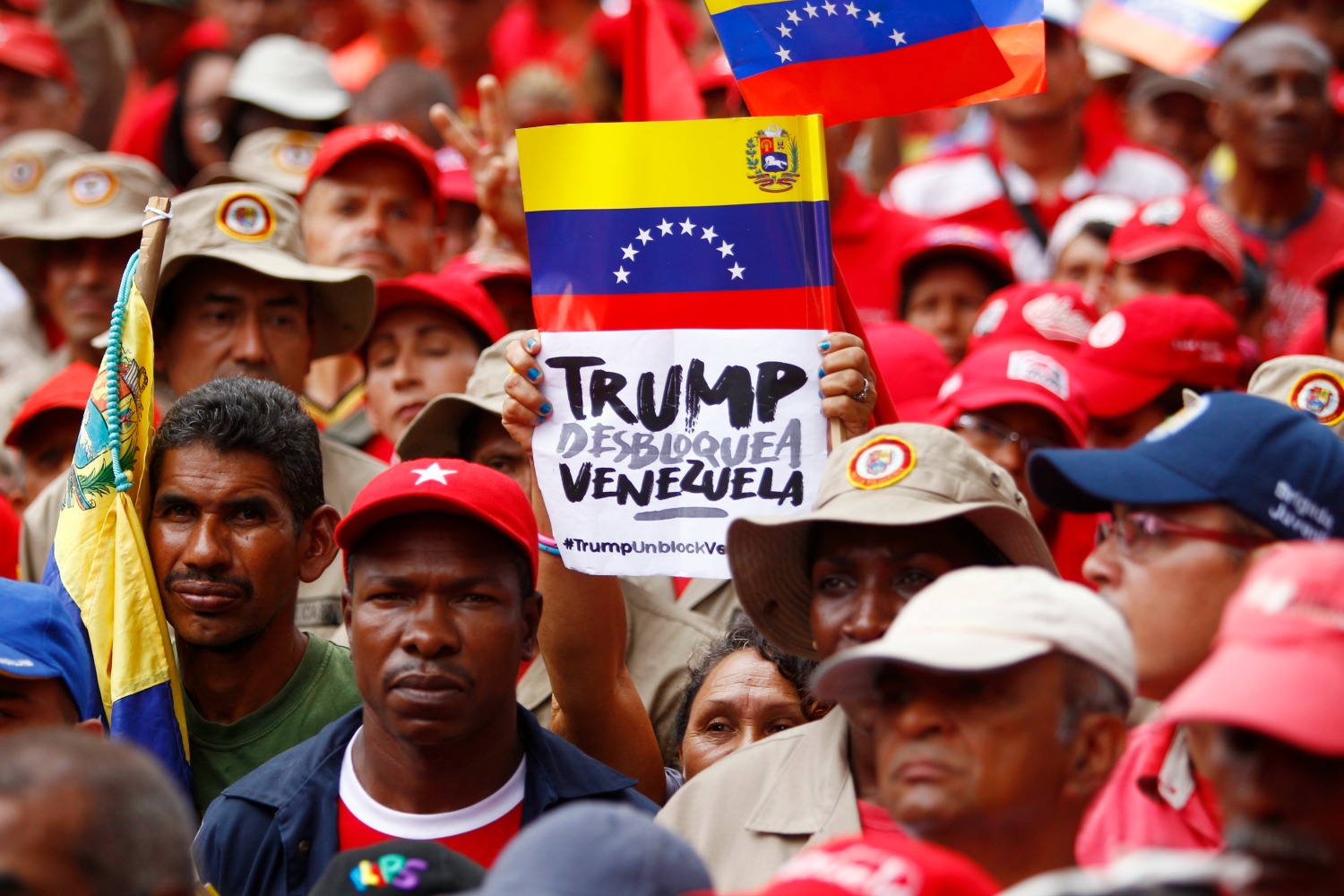 Members of the Bolivarian militia attend a protest against U.S. sanctions on Venezuela,