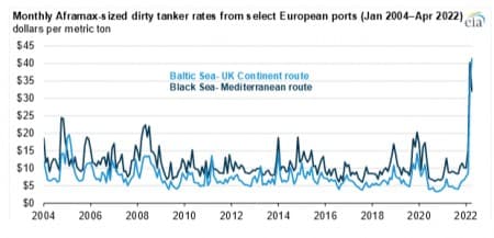 Dirty tanker rates for Aframax-sized vessels originating in the Black Sea in southeast Europe more than tripled to $32.10 per metric ton (mt) in April 2022 from $10.11/mt price in January 2022. The tanker rates for routes originating in the Baltic Sea in northern Europe rocketed to $41.38/mt in April 2022, up from $7.50/mt in January 2022. Due to a global shortage of Aframax ships, the dirty tanker rate for the Baltic-UK Continent (UKC) route jumped from $8.53/mt in January 2022 to $41.38/mt in April 2022.