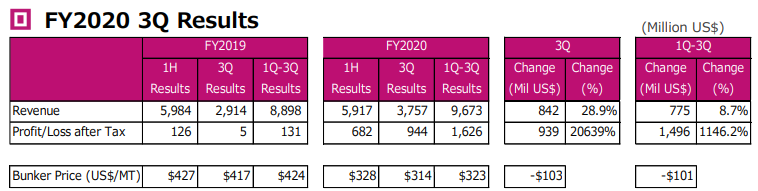 ONE does not provide color commentary on its results, simply posting an eight-page pdf to its website Friday. (When the cover and table of contents are removed, it’s actually a six-page document.) In a brief outline, ONE attributed the gigantic year-over-year Q3 gains to the “sharp recovery in cargo demand and increases in [the] short-term freight market.”