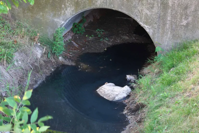 Despite Bartek installing a pump to try and stop the leak from draining toward Lake Ontario, water in the ditch just beyond the facility is black in this picture from July 8. As water continues down the ditch, it becomes clearer, but with each section of pipe, the darkness emerges. (Bobby Hristova/CBC)