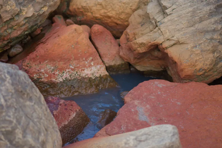 The outfall empties into Lake Ontario. The lakewater near the drain is also dark.