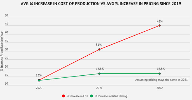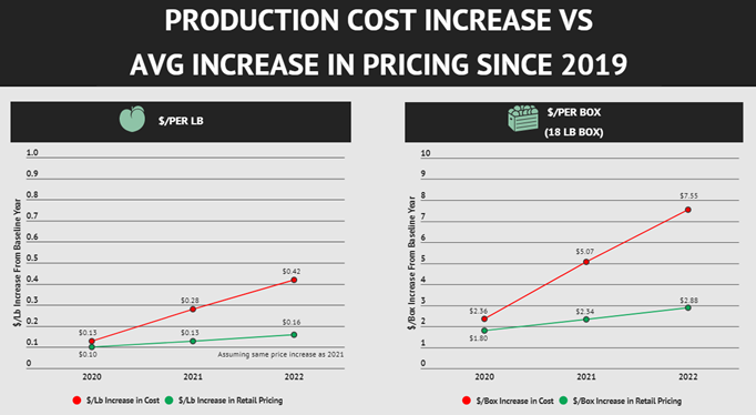 All of this means that for our industry to remain viable, we simply must charge more for our fruit. These increases have resulted in the overall production cost per box to increase $7. 55 since 2019. This increase is equivalent to $. 42 per pound. Unfortunately, retail pricing has not increased at the same pace. Since 2019, retail pricing has only seen an increase of $2. 88 per box or $. 16 per pound.