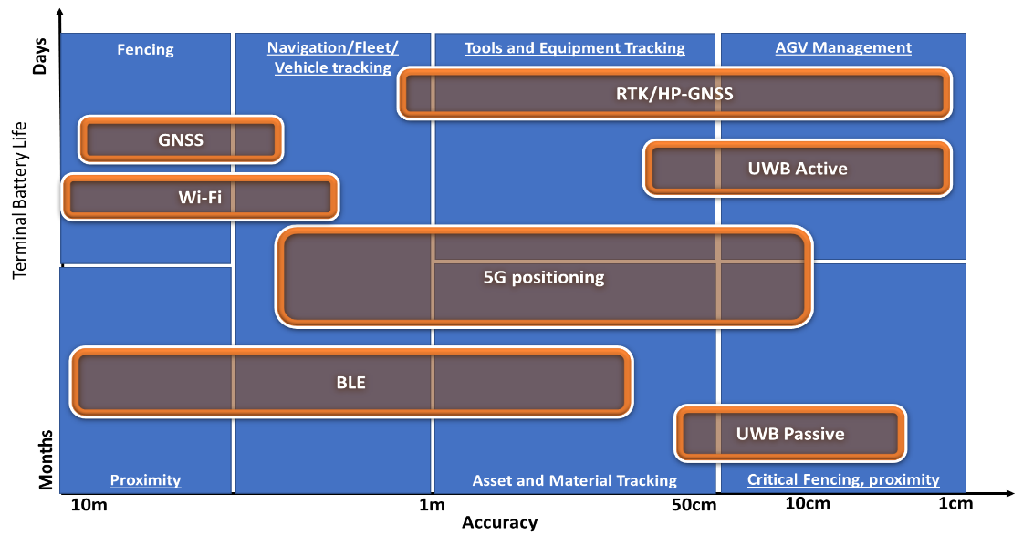 Mapping different RTLS technologies by power consumption and accuracy performance