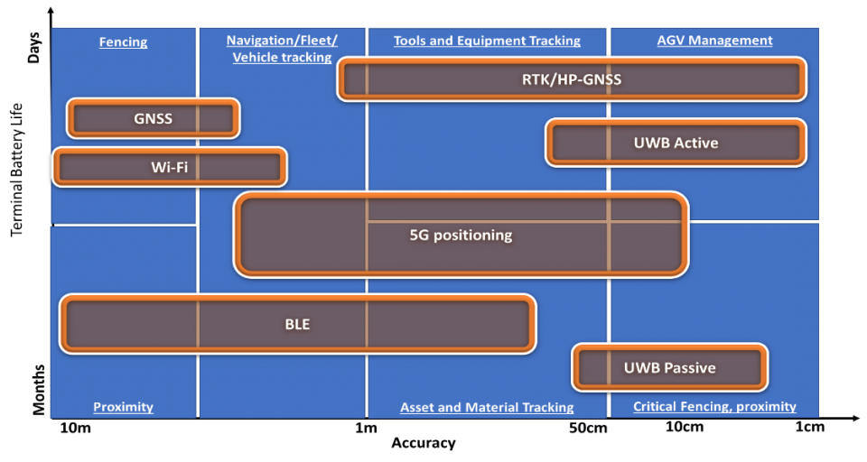 Mapping different RTLS technologies by power consumption and accuracy performance