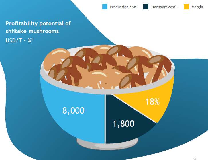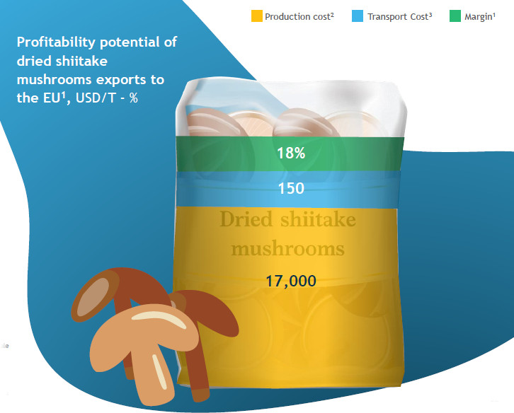 Dried shiitake mushrooms can also be exported to the EU at reasonable margins of about 18%, at a wholesale price of $21,000. The cost to produce shiitake mushrooms in Rwanda is about $17,000/tonne, while transport outlays are in the region of $150/tonne, assuming transport from Kigali to Dar es Salaam by road ($93/tonne) and then to Europe by sea freight ($57 tonne).