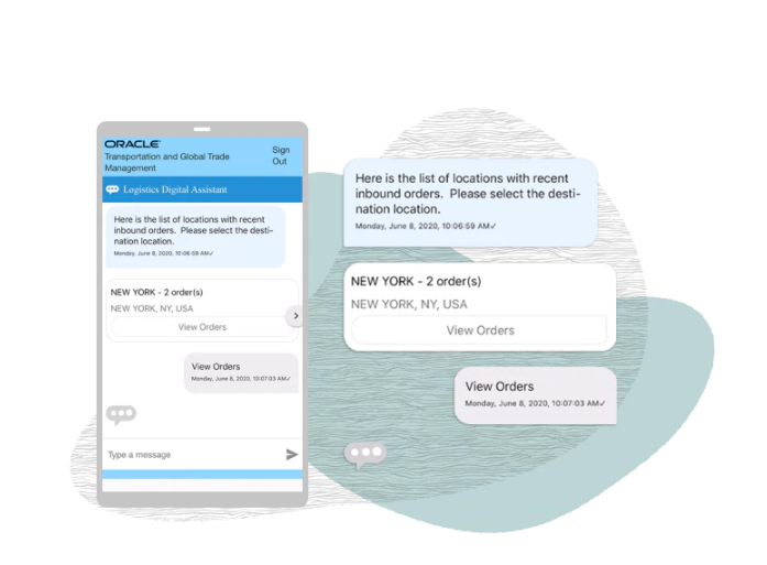 - Oracle Logistics Digital Assistant Capabilities with an enhanced conversational interface to access all shipment information and send requests while on the go.