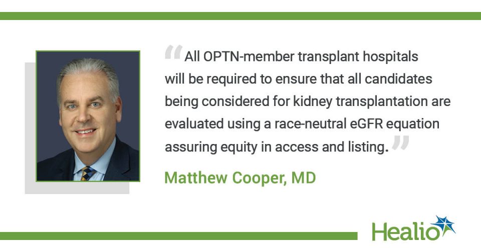 Cooper: All OPTN-member transplant hospitals will be required to ensure that all candidates being considered for kidney transplantation are evaluated using a race-neutral eGFR equation, which will assure equity in access and listing.