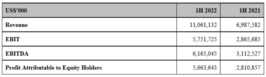 Earnings per ordinary share for the first half of 2022 was US$8.58, whereas earnings per ordinary share for the first half of 2021 was US$4.42.