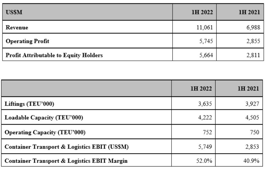 Orient Overseas (International) Limited (“OOIL”) today announced a profit attributable to equity holders of US$5,663.6 million for the six-month period ended 30th June 2022, compared to a profit of US$2,810.9 million for the same period in 2021.