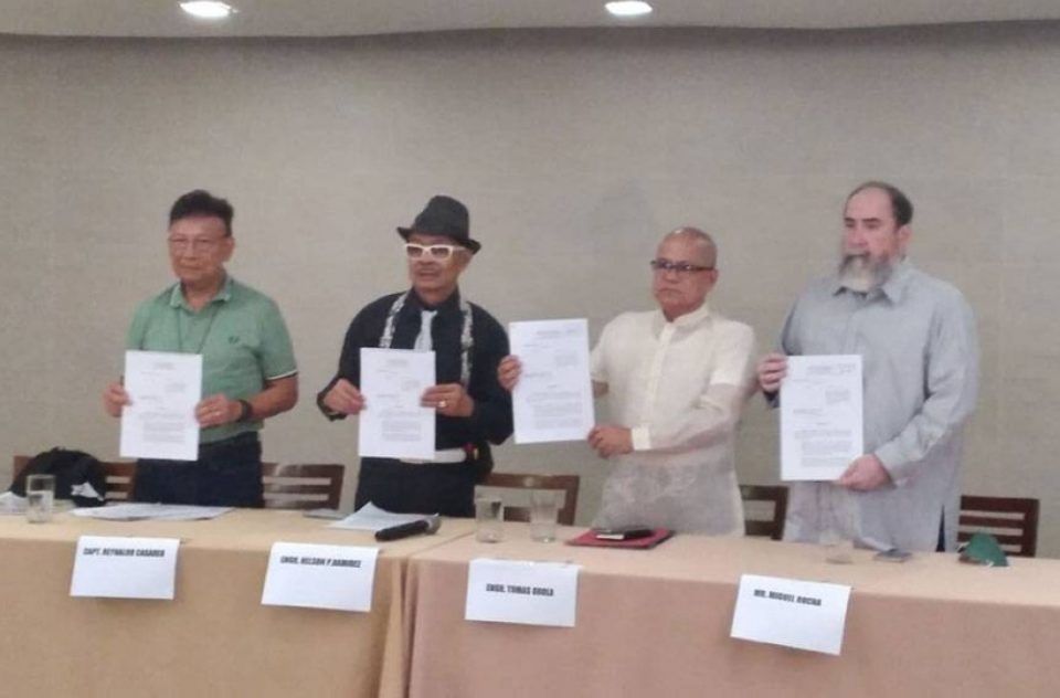 The complainant Tom Orola of Orophil Shipping ( 3rd from left) during a press conference on April 22 – with other maritime stakeholders supporting the company decision to file a case. FROM Left: Capt. Reynaldo Casareo, Cargo Safeway Inc.; Engr Nelson Ramirez, United Filipino Seafarers (UFS) and Miguel Angel Rocha, CEO of C. F Sharp Company. CONTRIBUTED PHOTO