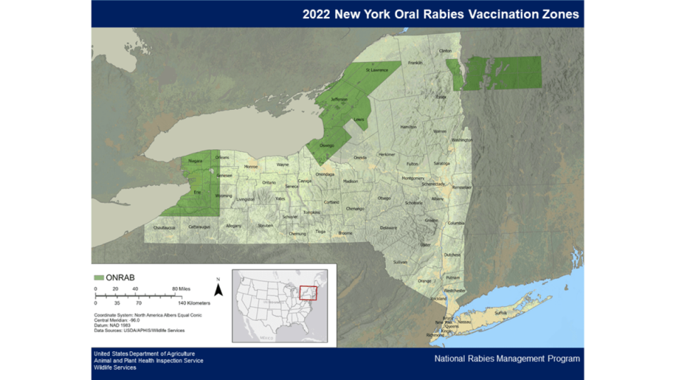 OSWEGO COUNTY – The Oswego County Health Department is working with the Wildlife Services Program of the U.S. Department of Agriculture to distribute oral rabies vaccine baits for wildlife across a large portion of the county.