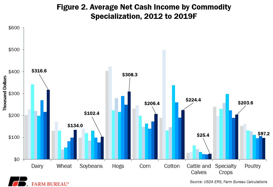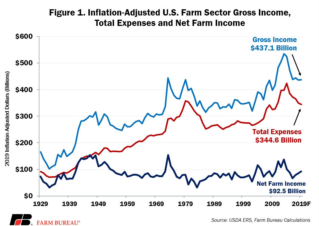 A broad measure of farm profitability, net farm income — the difference between gross income and production expenses — is now projected at $92.5 billion, up $8.5 billion, or 10%, from 2018. If realized, net farm income in 2019 will be the highest since 2014 but would remain 25% below 2013’s record high of $123 billion and would be marginally higher than the inflation-adjusted average of $90.5 billion. Figure 1 highlights gross income, production expenses and net farm income trends in 2019 inflation-adjusted dollars.