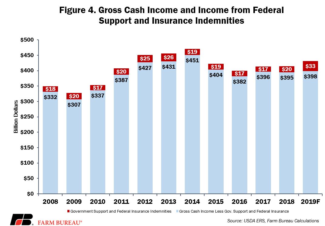 While a higher proportion of net farm income is expected to come from federal assistance programs in 2019 – 31%, according to USDA — as a proportion of total gross cash income, federal support is less than 10%, and over the last decade has averaged less than 5%. Importantly, this federal support includes more than ad hoc assistance and generally favors market-based assistance related to commodity prices or revenue and conservation-based incentives.