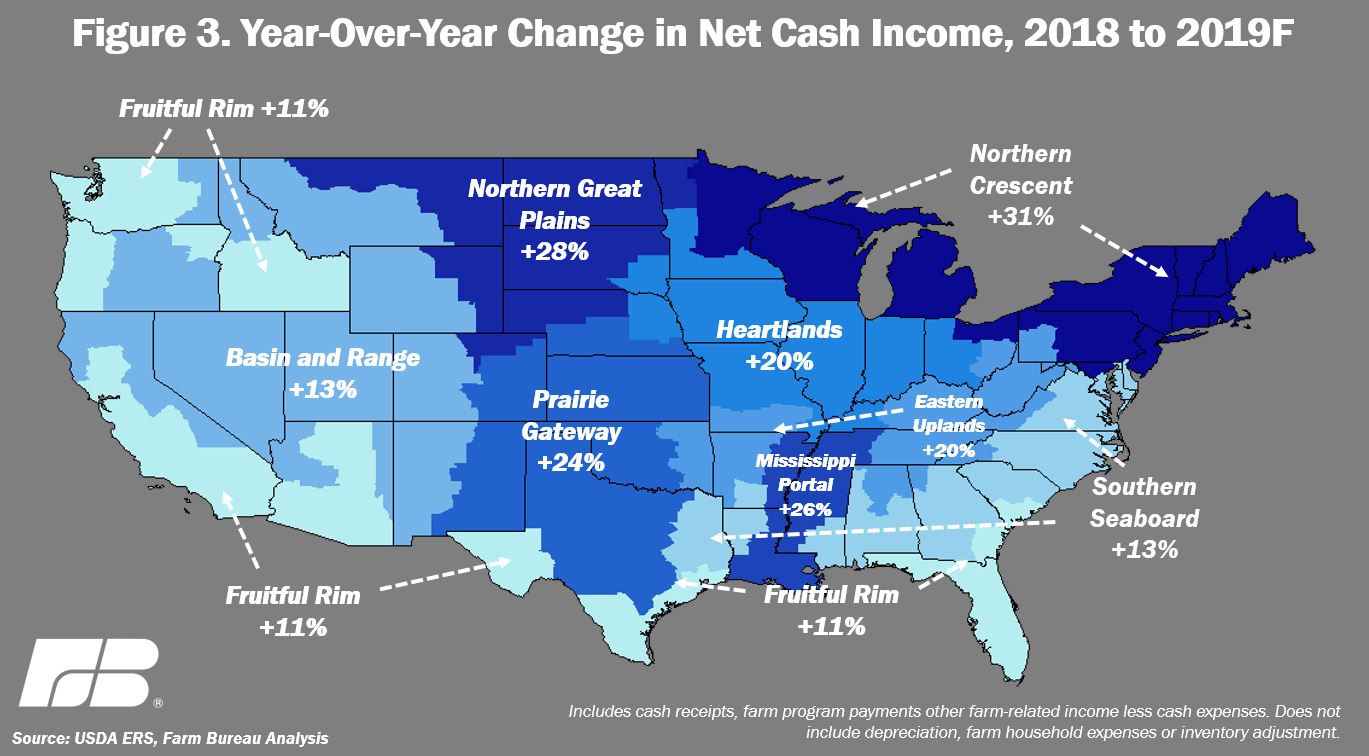 The improved outlook for farm income in 2019 is twofold. First, average net cash farm income across most major commodity categories is projected to be higher in 2019, driving an expected 20% increase in average net income across all of agriculture, Figure 2. Dairy is expected to see the most significant increase in net cash income, rising 47%. In addition, net cash income for wheat is expected to rise 35%, while net cash income for soybeans and hogs are also expected to climb, 34% and 24%, respectively. With a decline of 8%, poultry is the only commodity expected to post a lower net cash income in 2019. Figure 3 highlights the average change in net cash income across all production regions.