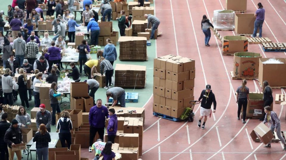 CEDAR FALLS — As volunteers filed down from the bleachers onto the floor of the UNI-Dome, Panther mascots T.C. and T.K. were there, giving high-fives and skipping through the tables awaiting volunteers to pack tens of thousands of plastic bags of food.