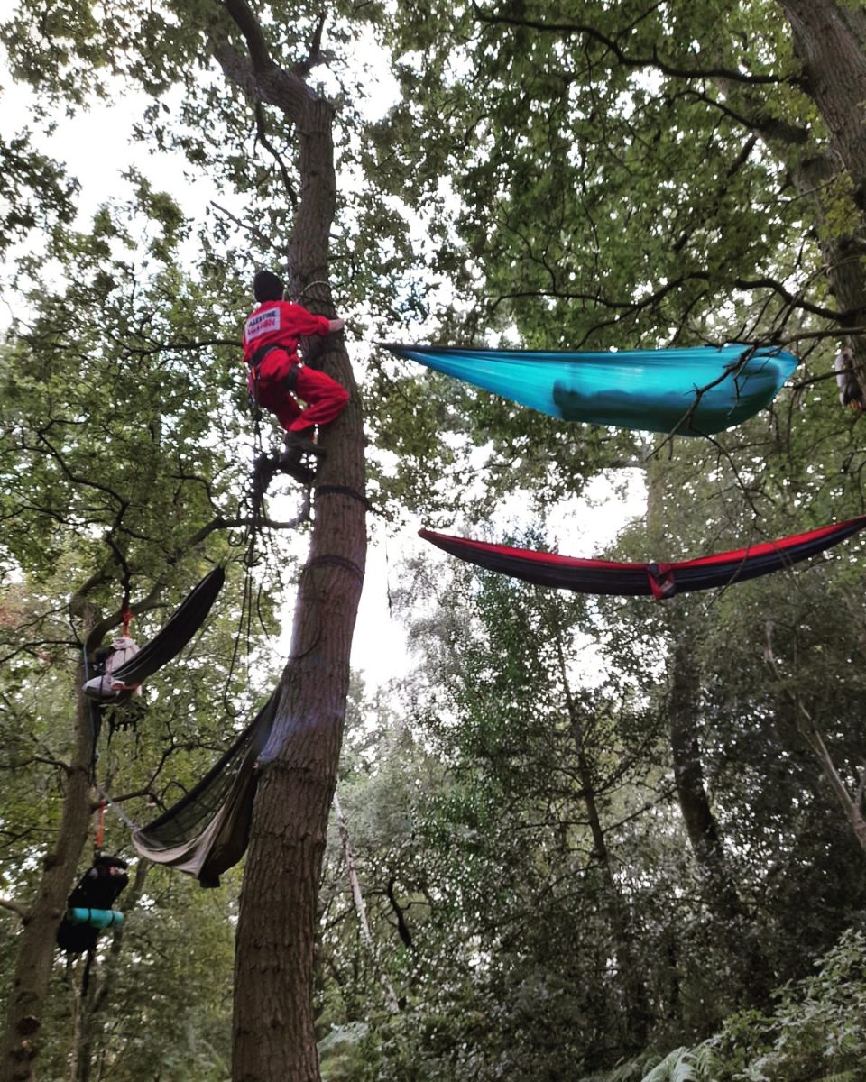 PALESTINE ACTION scaled trees and set up camp with hammocks outside UAV Engines in Shenstone, Staffordshire, at the weekend in an escalation of action to push the military drone manufacturer out.