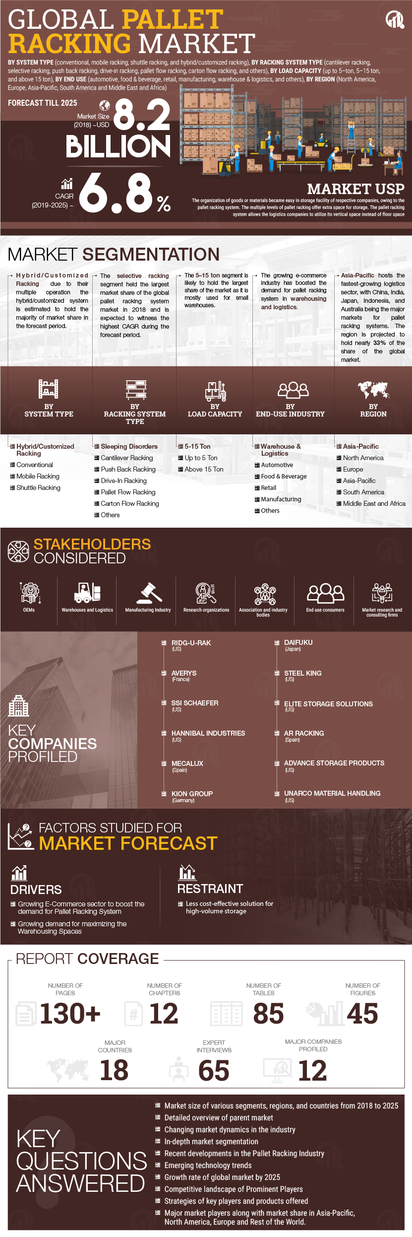 The latest report by Market Research Future (MRFR) asserts that the Global Pallet Racking Market 2020 is slated to procure a substantial market valuation from USD 8.2 billion in 2018, at a moderate 6.8% CAGR over the review period.