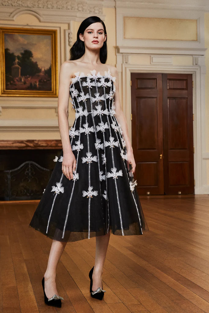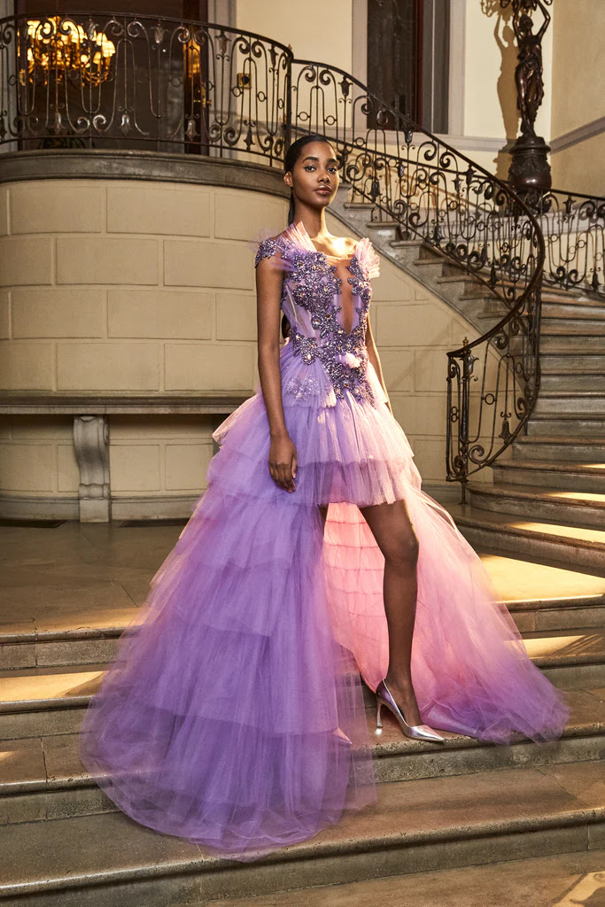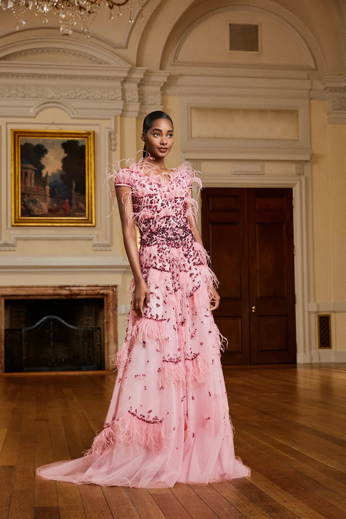 Imitating the little romantic details of the historical Fabergé Eggs, the designer creates intricate surfaces decorated with feathers, crystals, and other jewels. The silhouettes are timeless and romantic, the kind of dresses you keep in your closet for special occasions.