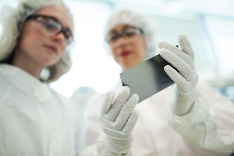 COURTESY PHOTO: TWIST BIOSCIENCE - Two Twist Bioscience employees hold up a sillicon chip the company uses for DNA synthesizing.