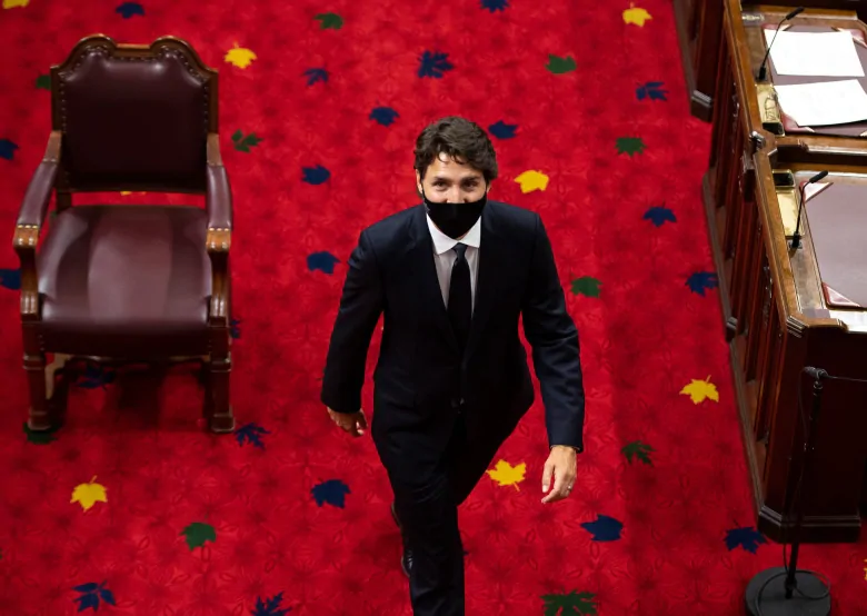 Prime Minister Justin Trudeau heads back to his seat before the delivery of the Speech from the Throne at the Senate of Canada Building in Ottawa, on Wednesday, Sept. 23, 2020. (Justin Tang/Canadian Press)