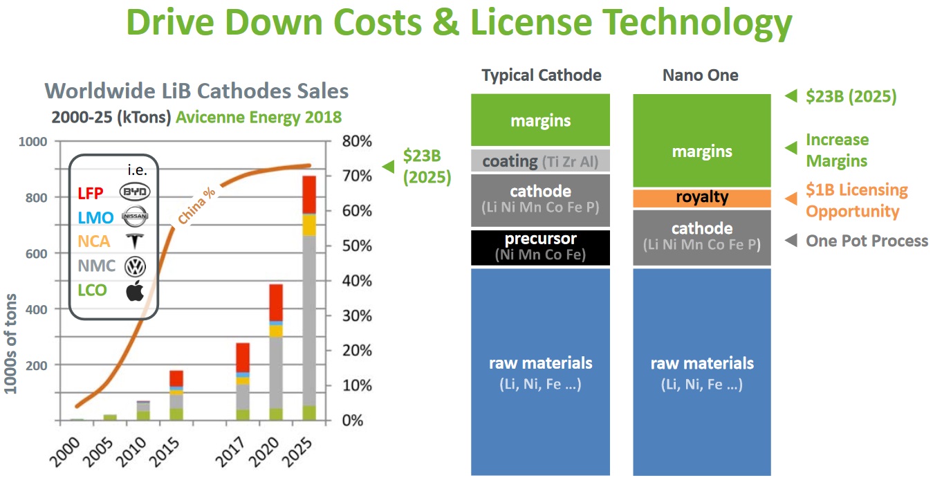 The key for any company to succeed is to find a niche need then fill that need with an affordable product. That is exactly what Nano One is doing. There is a massive need right now for cheaper and better lithium-ion batteries to make electric vehicles affordable to the masses. Nano One is already meeting that need by lowering the cost of batteries by improving (shortening etc) the production process (‘one pot process’), as well as improving the cathode’s performance by using better materials and better combinations.