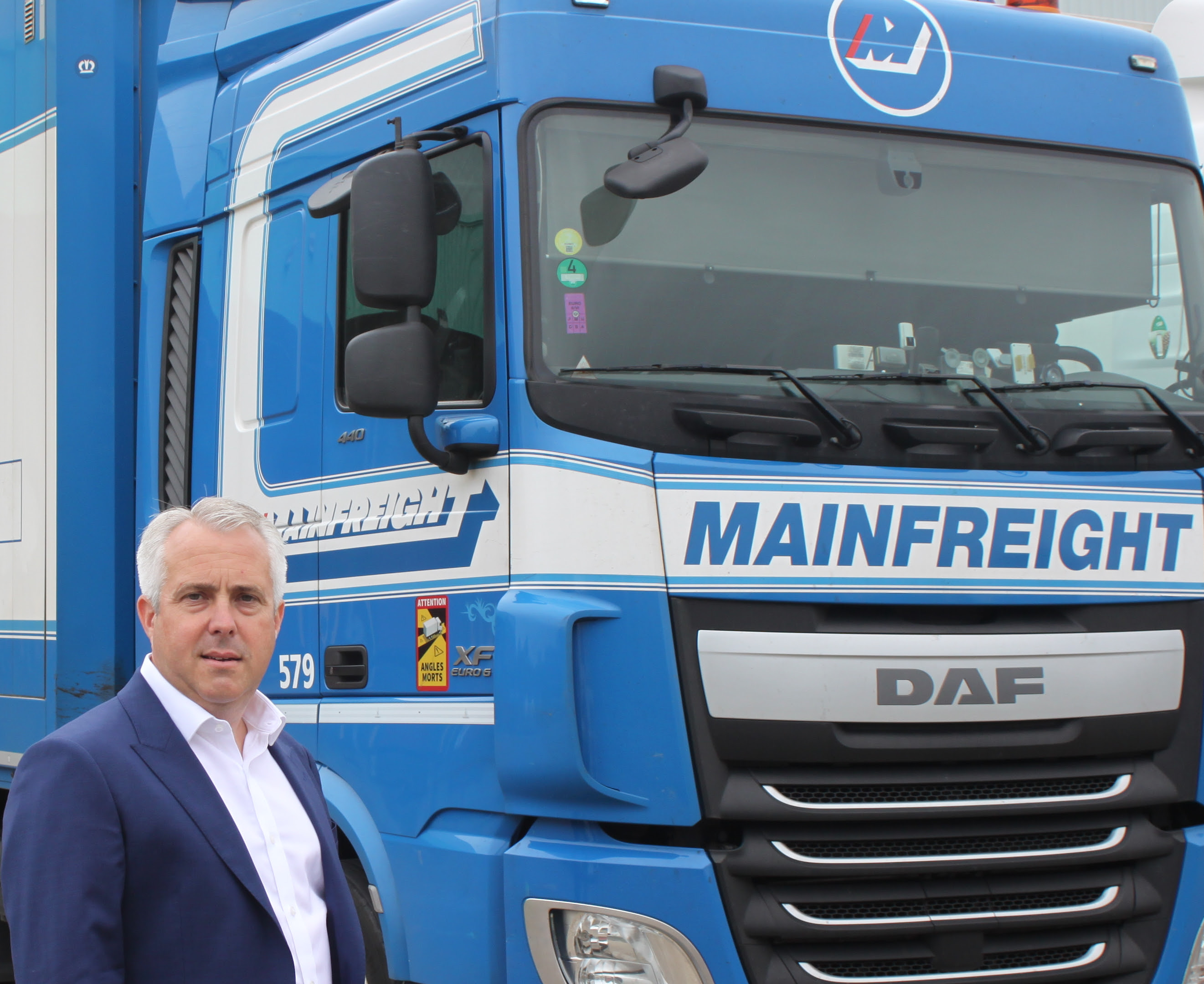 Danny Southby, head of European network at Davies Turner, alongside a Mainfreight truck.