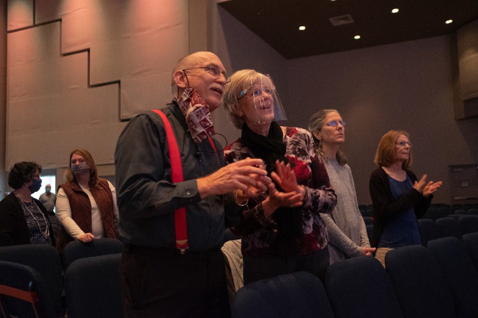In his recent newsletter, Bezner urged people to keep their masks on during the service. But many disregard the rules: As members found their seats for worship in the sanctuary, most took off their face coverings before belting out “Hark! The Herald Angels Sing.”