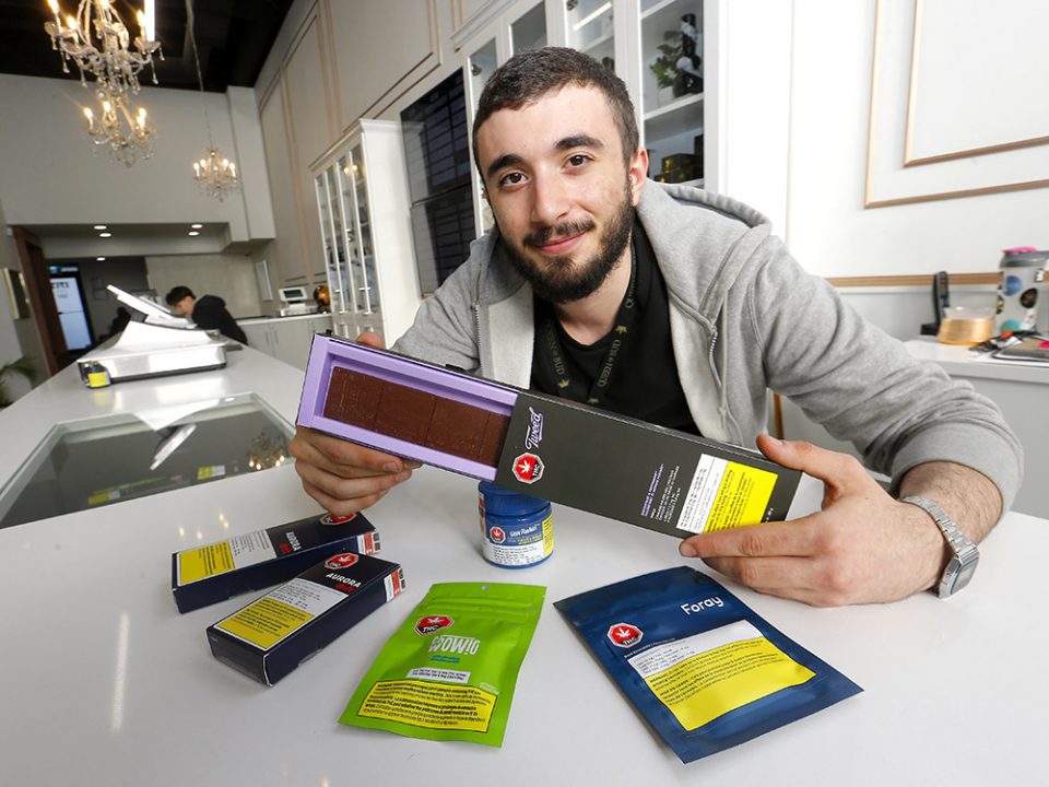 Adam Chammorry displays some of the edibles available at Queen of Bud in Calgary on Monday, January 13, 2020.
