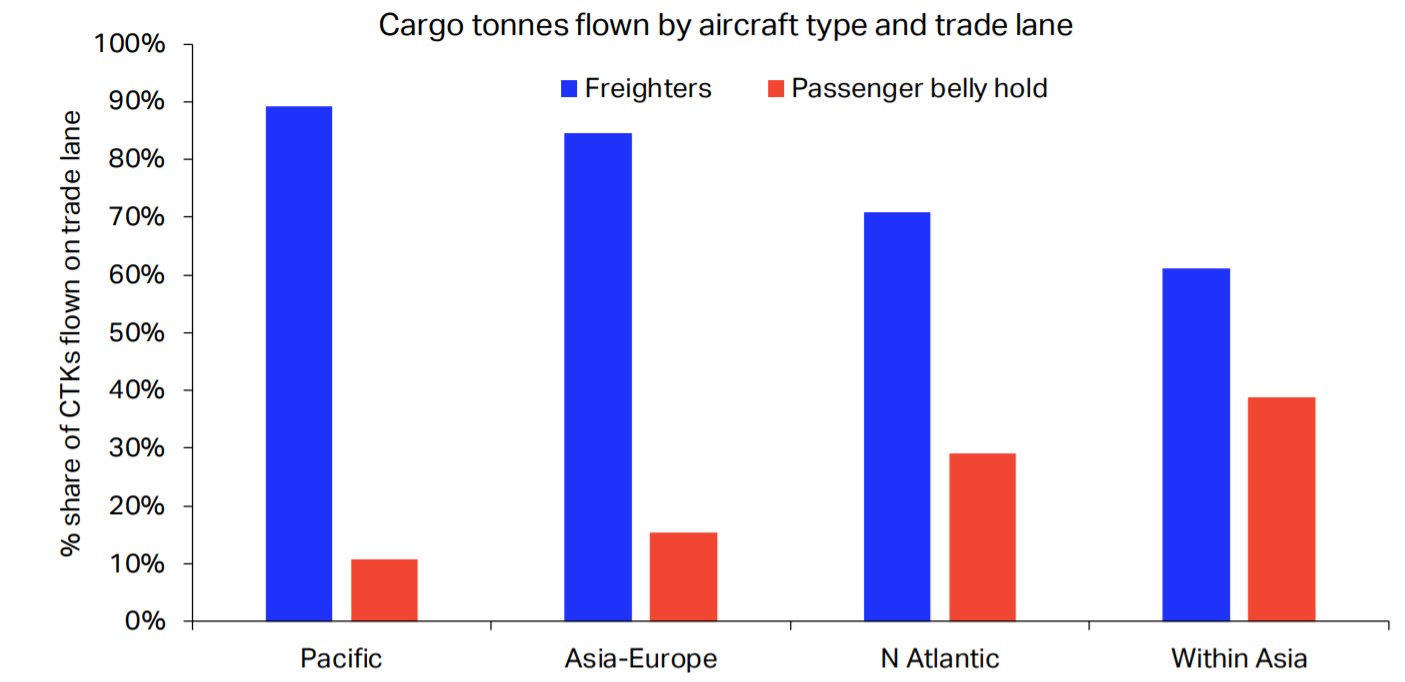 Intra-Asia routes heavily depend on passenger flights too, with less than 30% of air shipments flying on pure freighters before the pandemic.