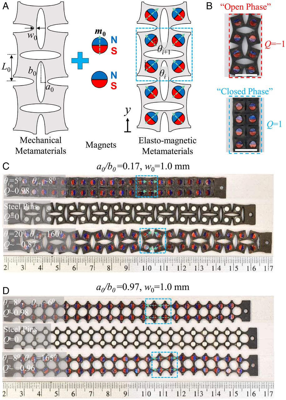 We observe two stable phases, which we refer to as “open” and “closed” regarding the state of the metamaterial pores. An open phase is induced by a strong repulsive interaction between neighboring magnetic domains with Q = −1, while with Q = 1 a closed phase develops (Fig. 1B). The phase states also depend upon the geometry of the metamaterial. For example, for elliptical pores (a0/b0 = 0.17), the elasto-magnetic metamaterials support the open phase with Q = 0 and −1 and the closed phase at Q = 1 (Fig. 1C). In contrast, circular pores (a0/b0 = 0.97) only support an open phase for all Q-values (Fig. 1D).