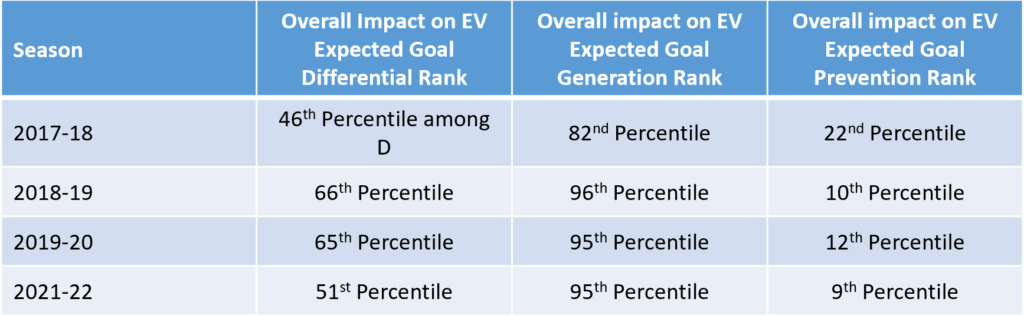 DeAngelo very clearly provides power play value to his clubs and has graded out as a break-even play-driver as even strength for years. He even has three seasons that saw him produce over nine Goals Above Replacement for his clubs (2018-19, 2019-20 and 2021-22), placing him solidly in the top-50 among NHL blueliners in all three years.