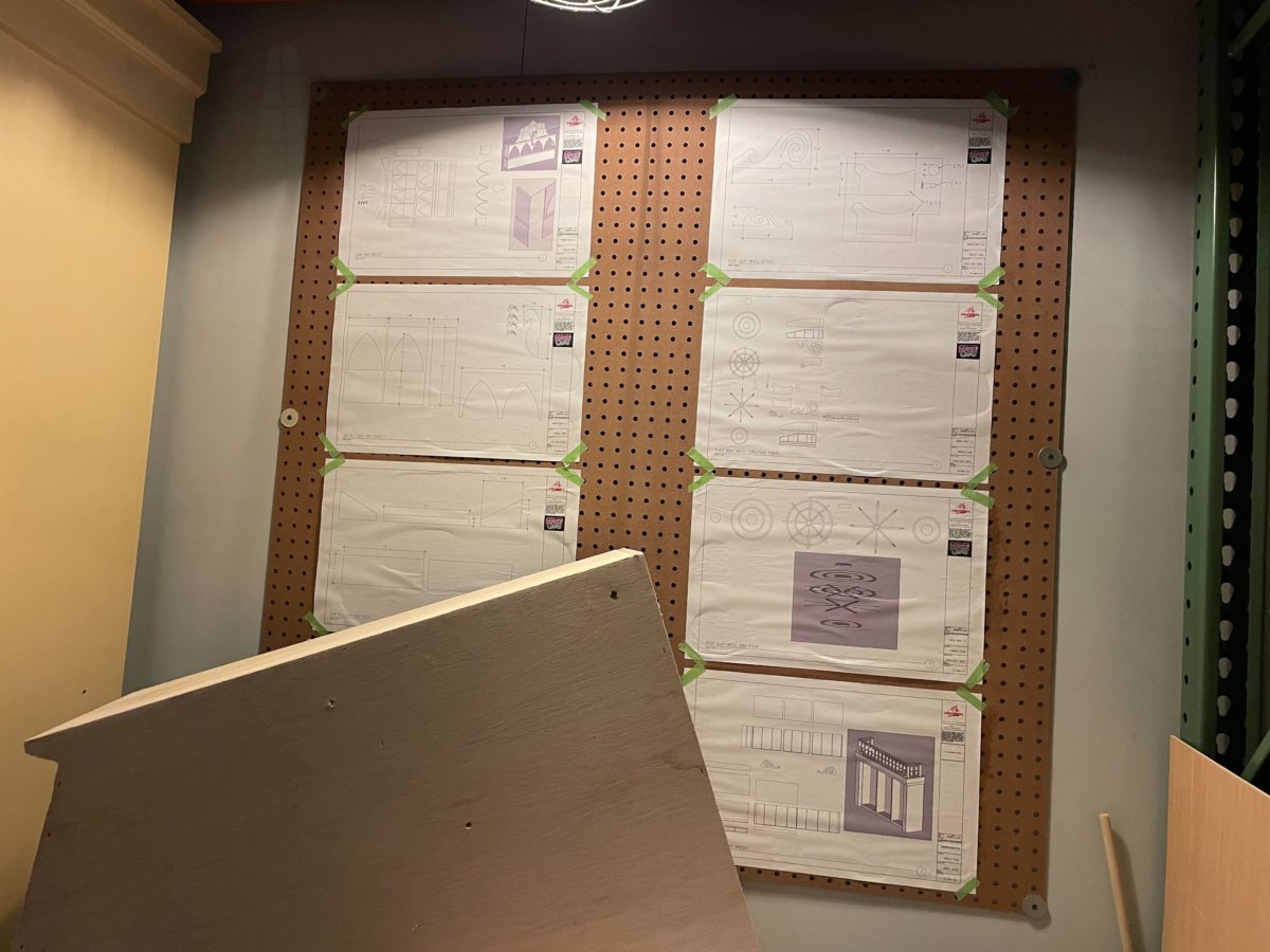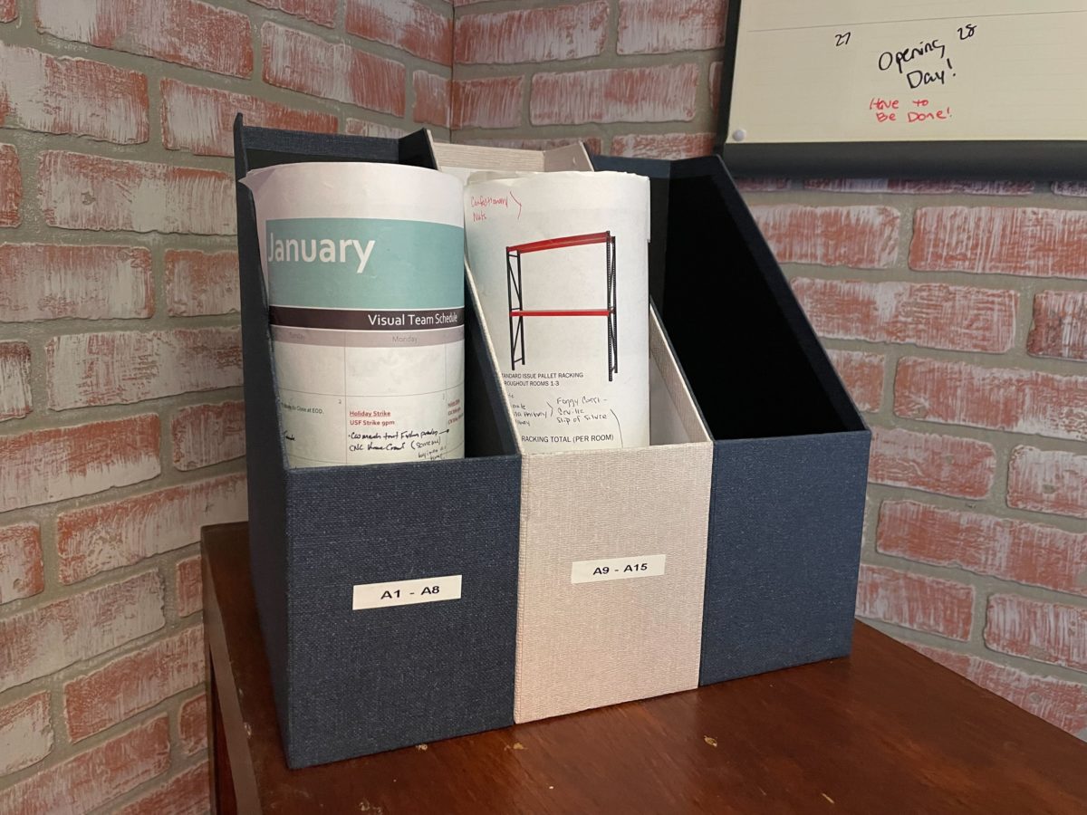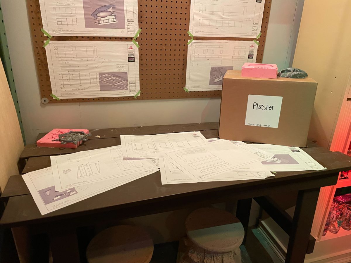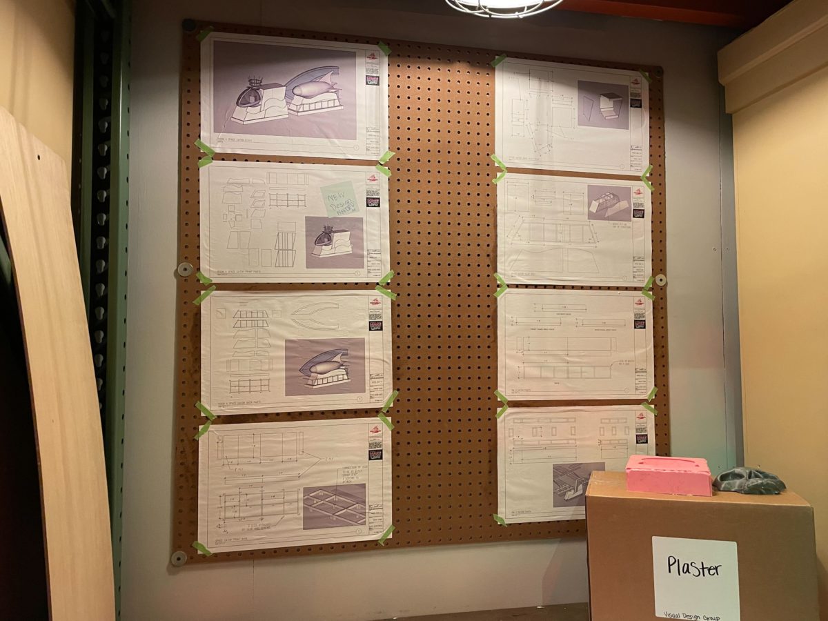 One wall is covered in giant blueprints and concept images.
