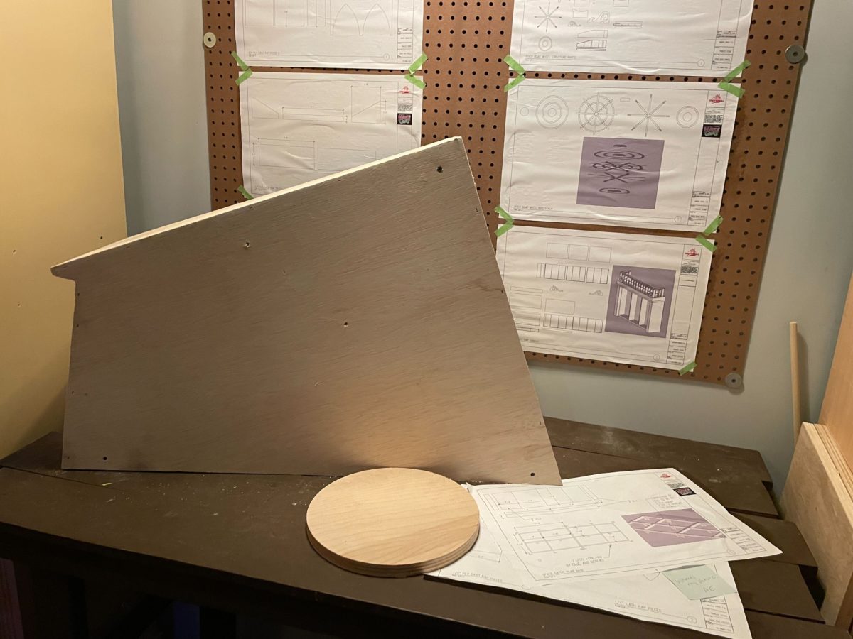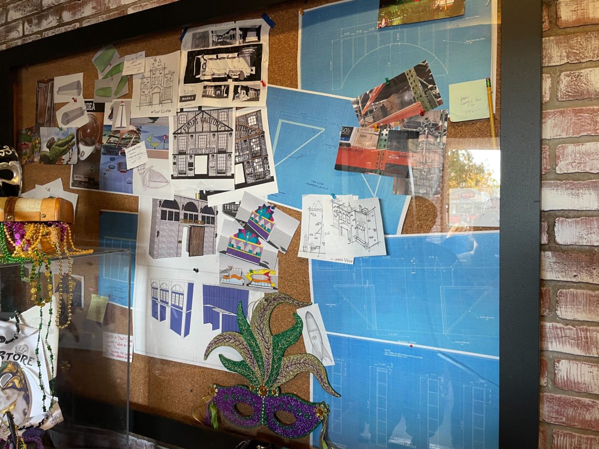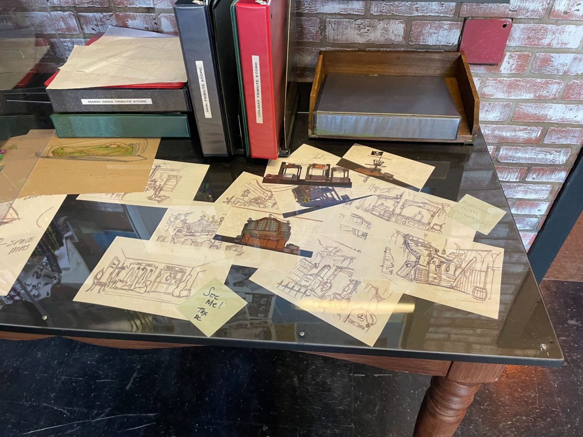 Blueprints, artwork, and photos for the store are on a corkboard (all protected by glass).