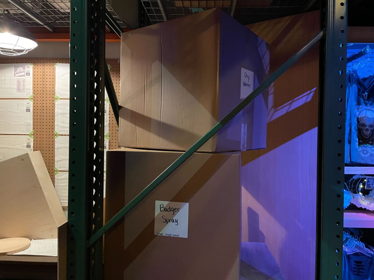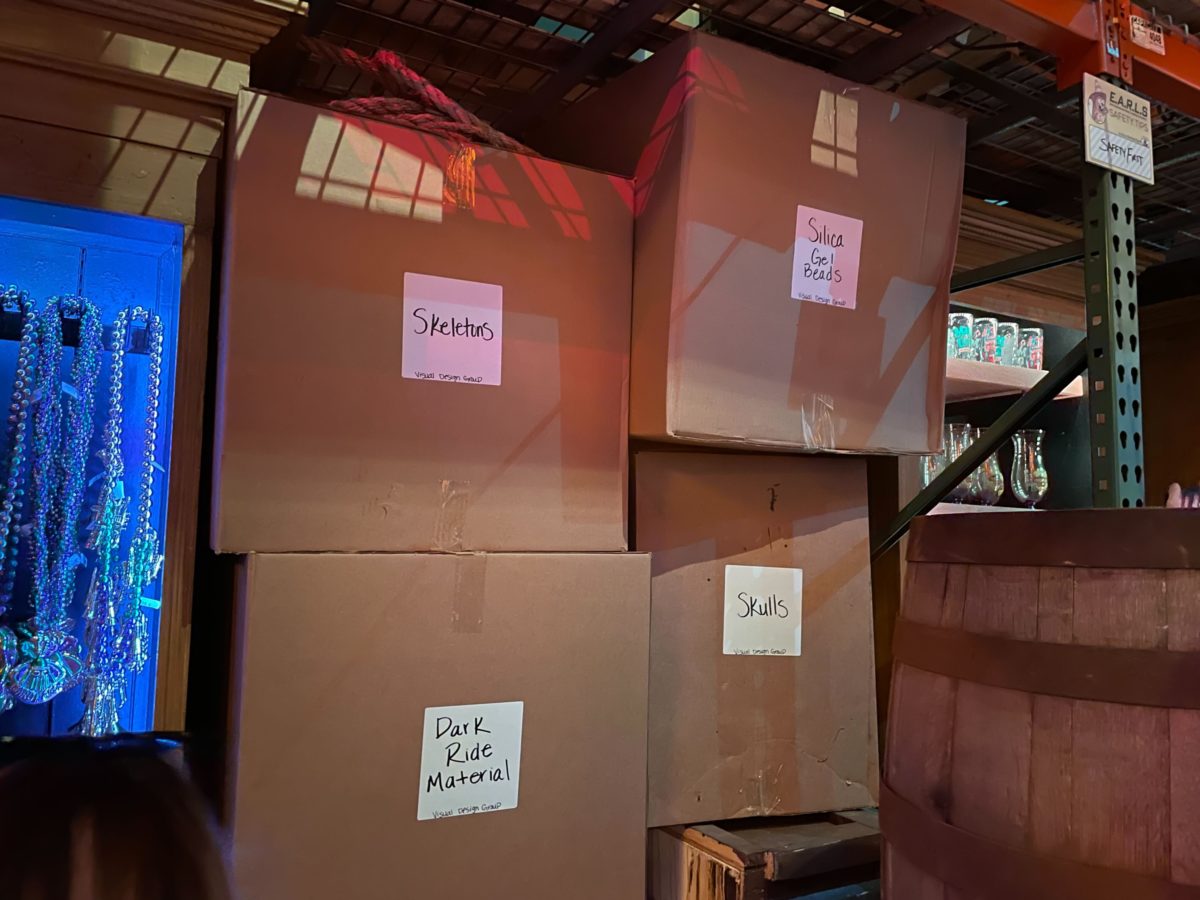 Cardboard boxes are labeled “skeletons,” “dark ride material,” “silica gel beads,” and “skulls.”