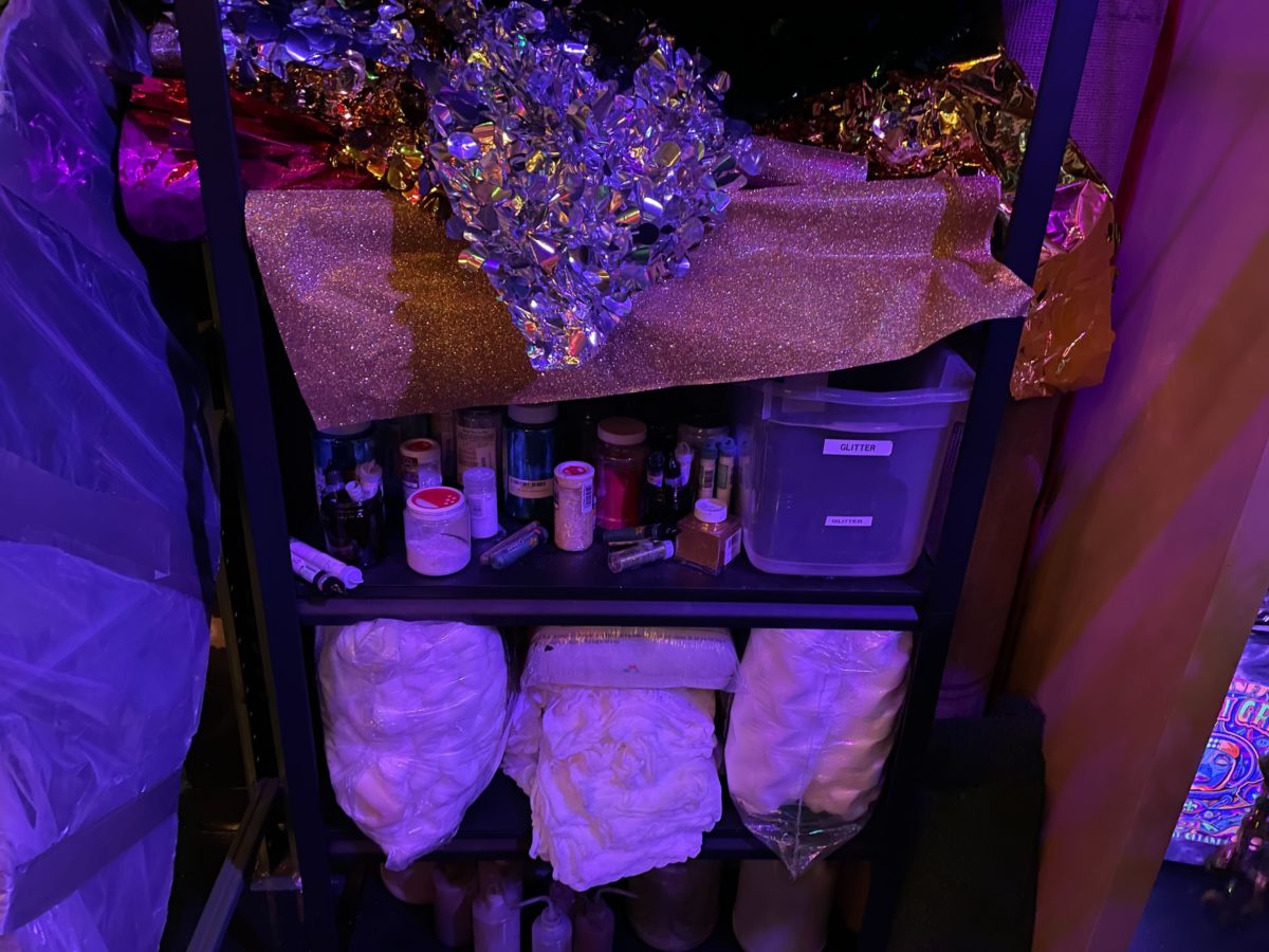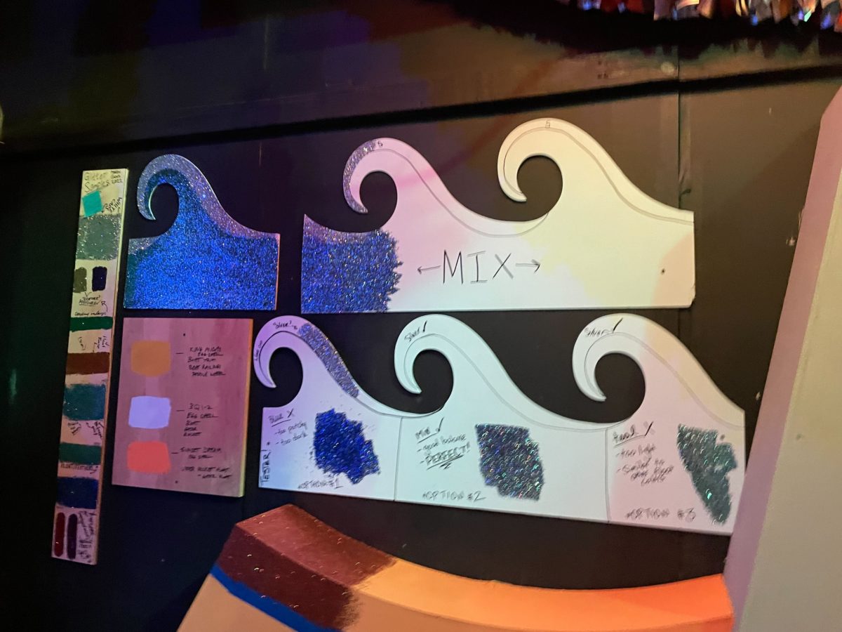 This room instantly hits you with more color. Glitter tests for a wave float are on the wall.