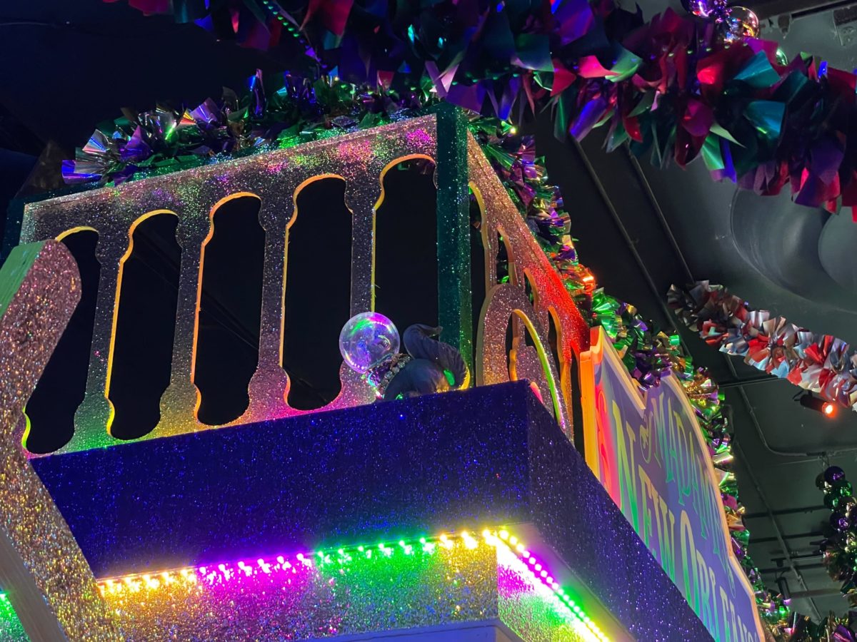 He’s even wearing his own space helmet for a visit to Planet Mardi Gras, which is catching the colorful lights.
