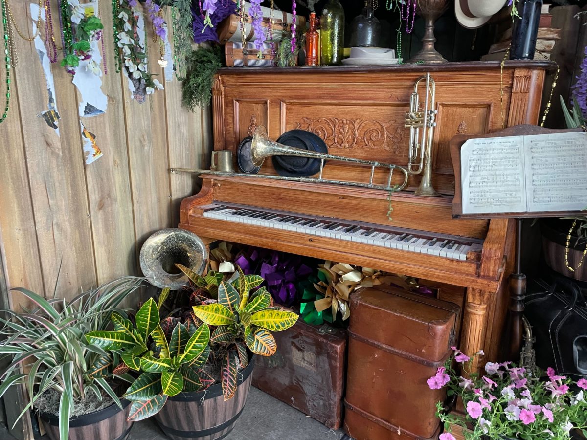 And at the exit is a piano, covered in jazz instruments and surrounded by plants.