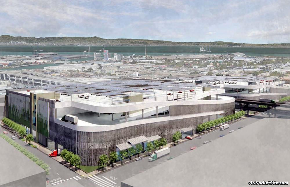 Since refined by Prologis, the massive “San Francisco Gateway” project would rise up to 115 feet in height on either side of I-280 and yield nearly 1.2 million square feet of “Production, Distribution and Repair (PDR)” space, with 760,000 square feet allocated to parcel/last mile delivery uses, 372,000 square feet for wholesale and storage, and a token 35,000 square feet for light manufacturing/maker uses; along with parking for 1,166 vehicles, 72 loading spaces, two logistics yards and 8,400 square feet of ground floor retail space.