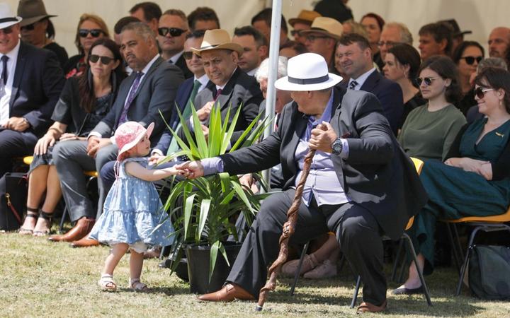 Prime Minister Jacinda Ardern's daughter Neve Te Aroha Gayford plays at the feet of those sitting near the pae.