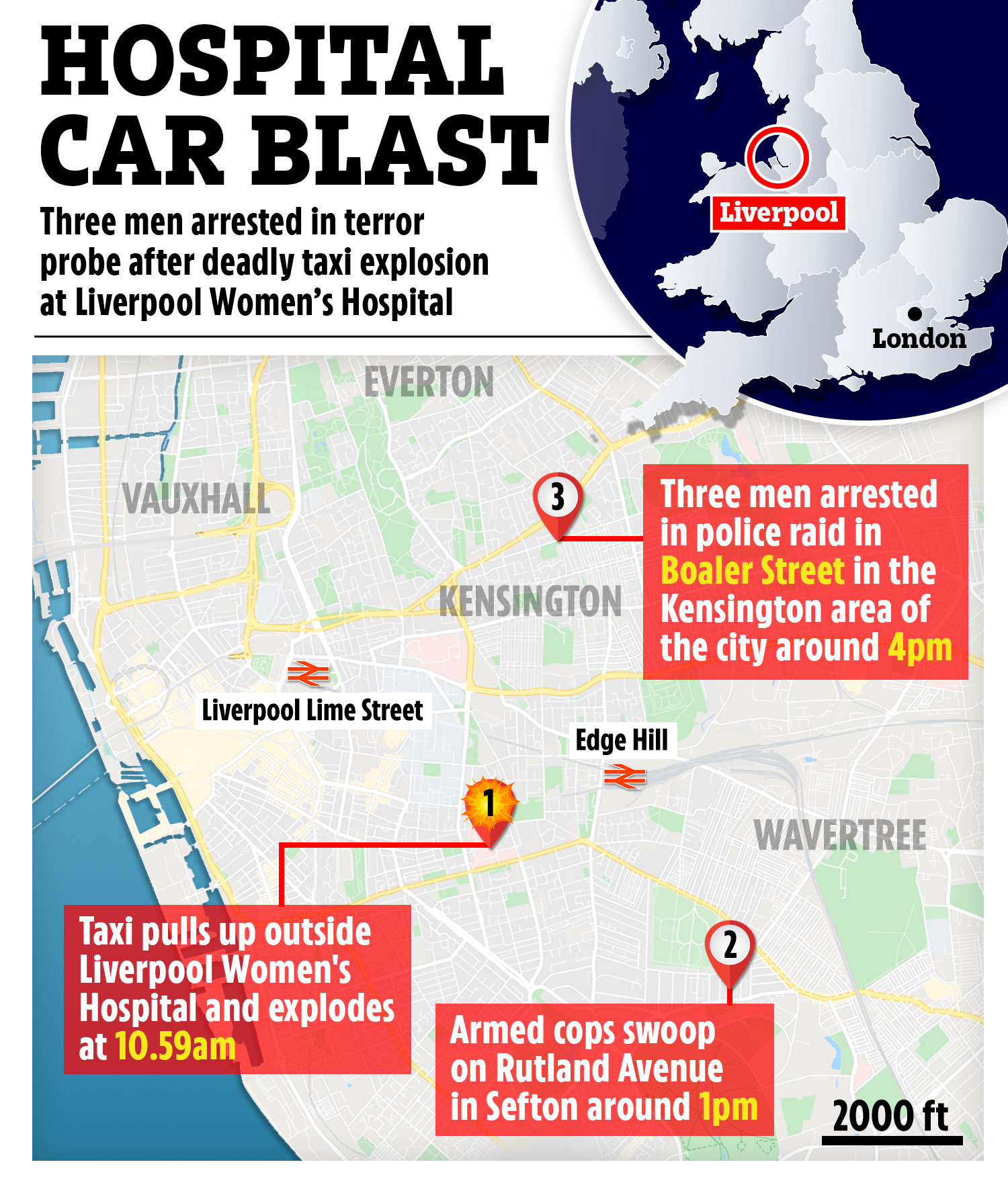 - A terrorist was killed and taxi driver injured in a car bomb blast at Liverpool Women’s Hospital yesterday
