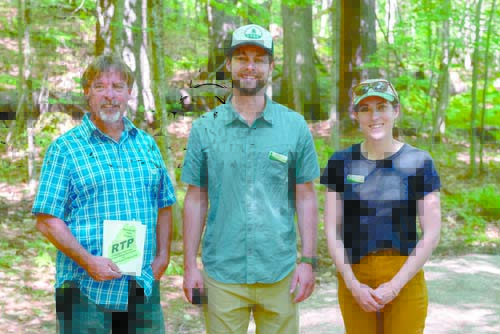 YEARS OF WORK went toward putting in a universal trail. Loon Echo Land Trust staff pose on ribbon-cutting day (from left to right) Stewardship Manager Jon Evans, Executive Director Matt Markot, and Development & Outreach Manager Maggie Lynn. (Photo courtesy of Peter Lewis, of QuirkWorks Studio)