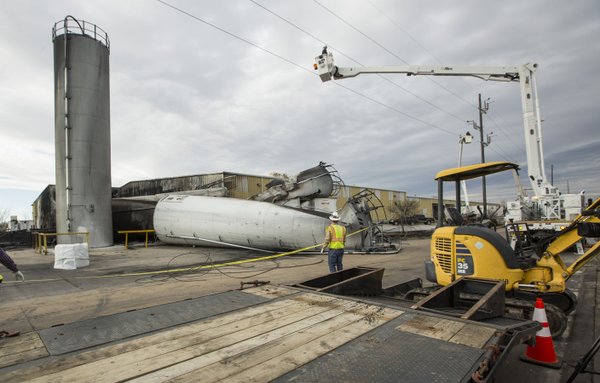 File Photo/NWA Democrat-Gazette/BEN GOFF •@NWABENGOFF Utility workers repair power lines Thursday near collapsed silos at United Industries in Bentonville. Go to nwaonline.com/photos to see more photos.