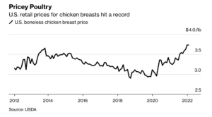 “Retail prices for chicken breasts in America reached a record last month before the virus hit farms there, while the cost of large eggs has hit the highest since 2018.”