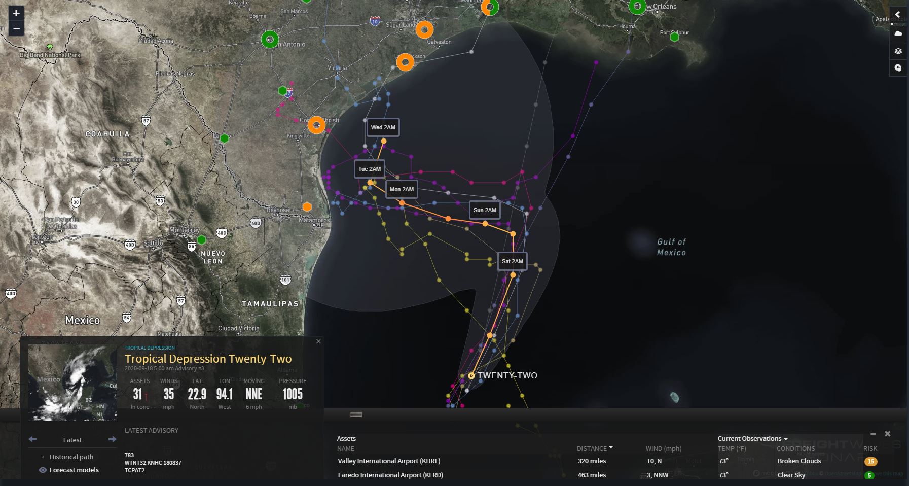 TD 22’s biggest impact will be periods of torrential rainfall and the potential for significant flooding along the Texas coast and possibly areas just inland. Precise totals cannot be predicted at this time, but the National Weather Service (NWS) forecast for southern Texas shows totals of 6 to 10 inches in some areas through the idle of next week. The worst conditions will probably hit southern Texas, but heavy rainfall could spread to the upper Texas and southwestern Louisiana coasts too.