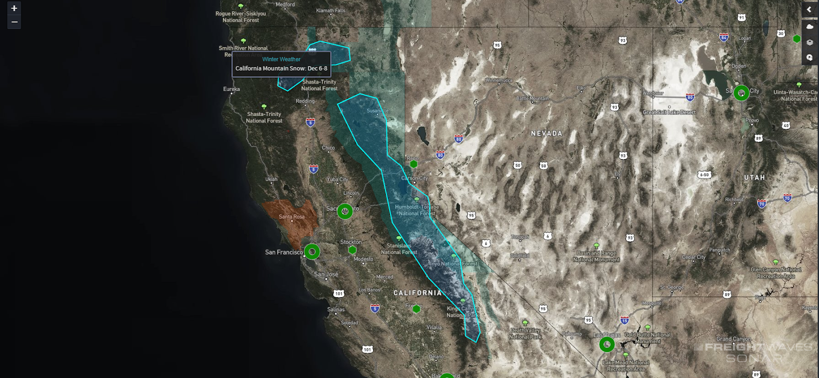 Meteorologists at the National Weather Service (NWS) told FreightWaves that a storm like this is “not unusual at all [for early December].” They added that “A ‘typical’ winter storm will easily bring one to three feet of snow in the high Sierra” and conditions on I-80 “can be dicey up there anytime it snows.” So, the effects of the storm should be taken seriously. The NWS has posted a Winter Storm Warning for the region.