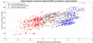 This also led to the UK achieving a record low carbon intensity for power generation of 21 grams of CO2 per kilowatt hour (kWh). The red triangles in the chart below show how lower demand for electricity during lockdown correlated with lower carbon intensity (the record low carbon intensity was recorded at a weekend, hence its exclusion from the chart).