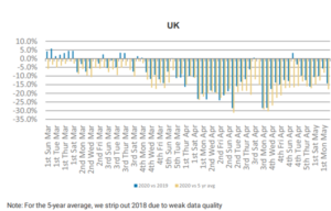 - UK power demand was down 20-30%, versus the five-year average, during lockdown, but the total share made up of renewable energy increased sharply.