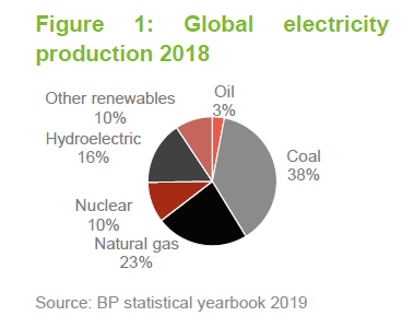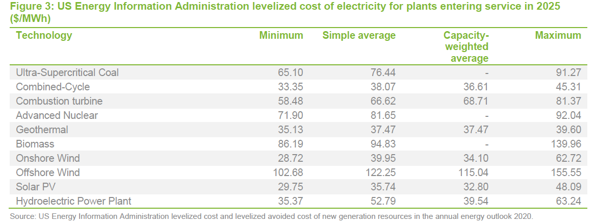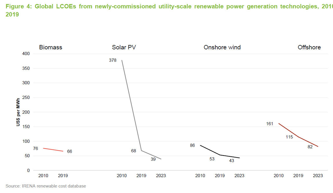 The all-in cost of electricity generated by renewables has been falling, as is evidenced in Figure 4, which compares the global weighted average levelised cost of electricity (LCOE) for various technologies in 2010 with that in 2019 and a forecast level for 2023.